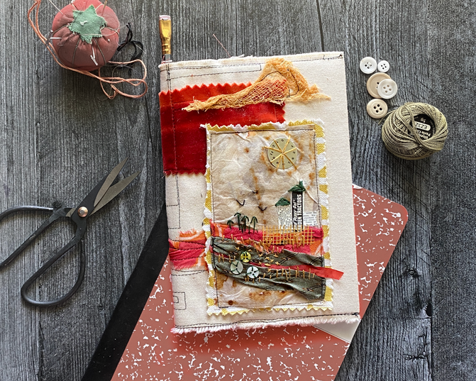 A piece of silk from a man's necktie, fabrics, embroidery floss, buttons, and other embellishments that you apply to the tea bag all come together to tell a visual story called a Snippet.